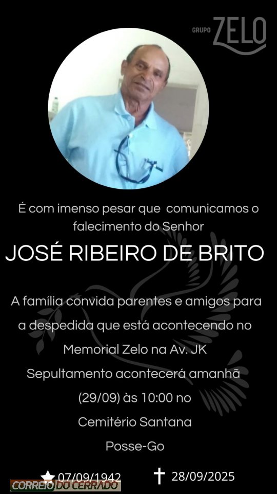 O Grupo Zelo e a família Brito, comunicam com pesar o falecimento de Jose Ribeiro de Brito, ocorrido neste domingo (28), aos 83 anos de idade.