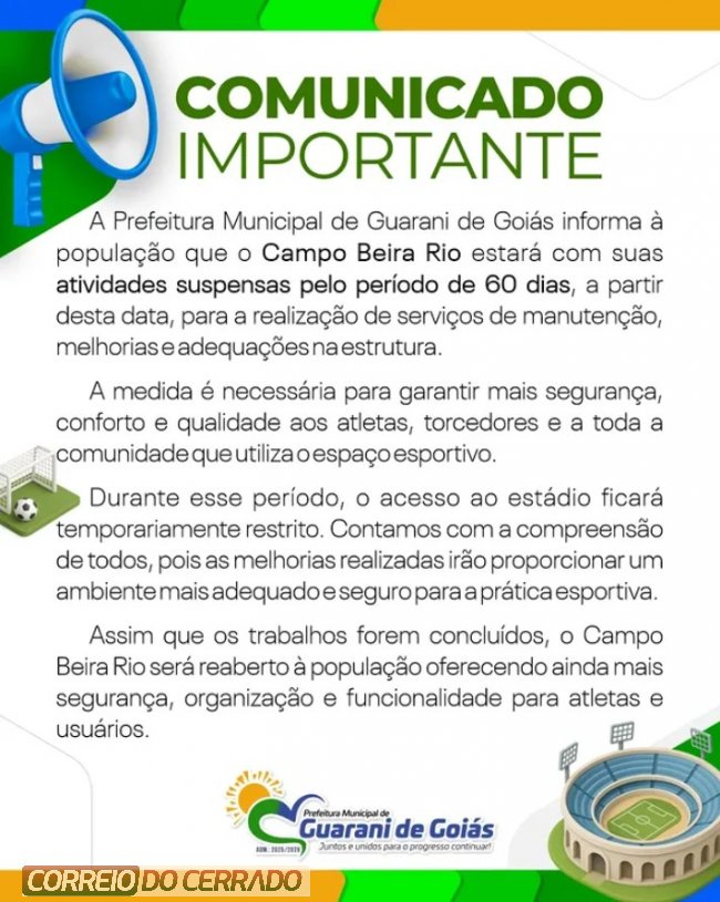 A Prefeitura Municipal de Guarani de Goiás informou que o Campo Beira Rio terá suas atividades temporariamente suspensas pelo período de 60 dias, a partir desta data. A interrupção ocorre para a realização de serviços de manutenção, melhorias e adequações na estrutura do espaço esportivo.