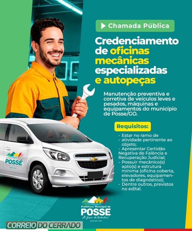 A Prefeitura de Posse publicou o Edital de Credenciamento Público nº 008/2025, com o objetivo de cadastrar oficinas mecânicas especializadas e empresas de autopeças interessadas em realizar manutenção preventiva e corretiva dos veículos leves e pesados, máquinas e equipamentos que compõem a frota municipal.