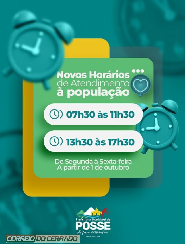 A partir do dia 1º de outubro, a Prefeitura de Posse passa a atender em novo horário para oferecer mais tempo, mais acesso e mais comodidade à população.