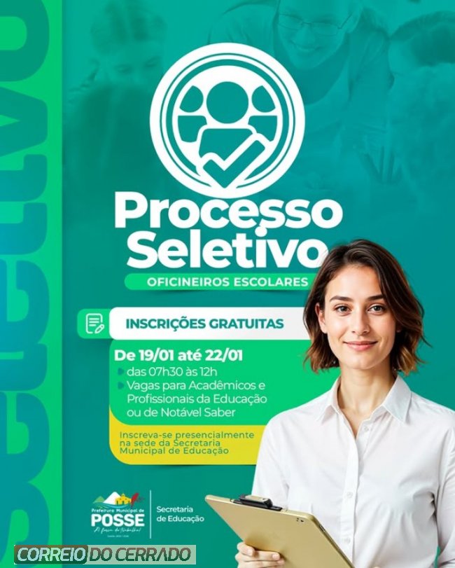 A Prefeitura Municipal de Posse tornou público o edital de Processo Seletivo Simplificado para contratação de oficineiros que irão atuar na Rede Municipal de Educação, por meio do Programa de Escolas Integrais e da Jornada Ampliada Escolar.