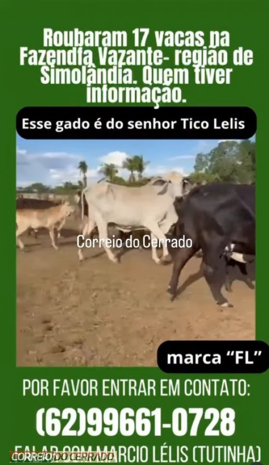 Um furto de 17 vacas foi registrado na Fazenda Vazante, localizada na região de Simolândia/GO. Os animais desapareceram recentemente, e a família proprietária está mobilizada para tentar localizar o rebanho.